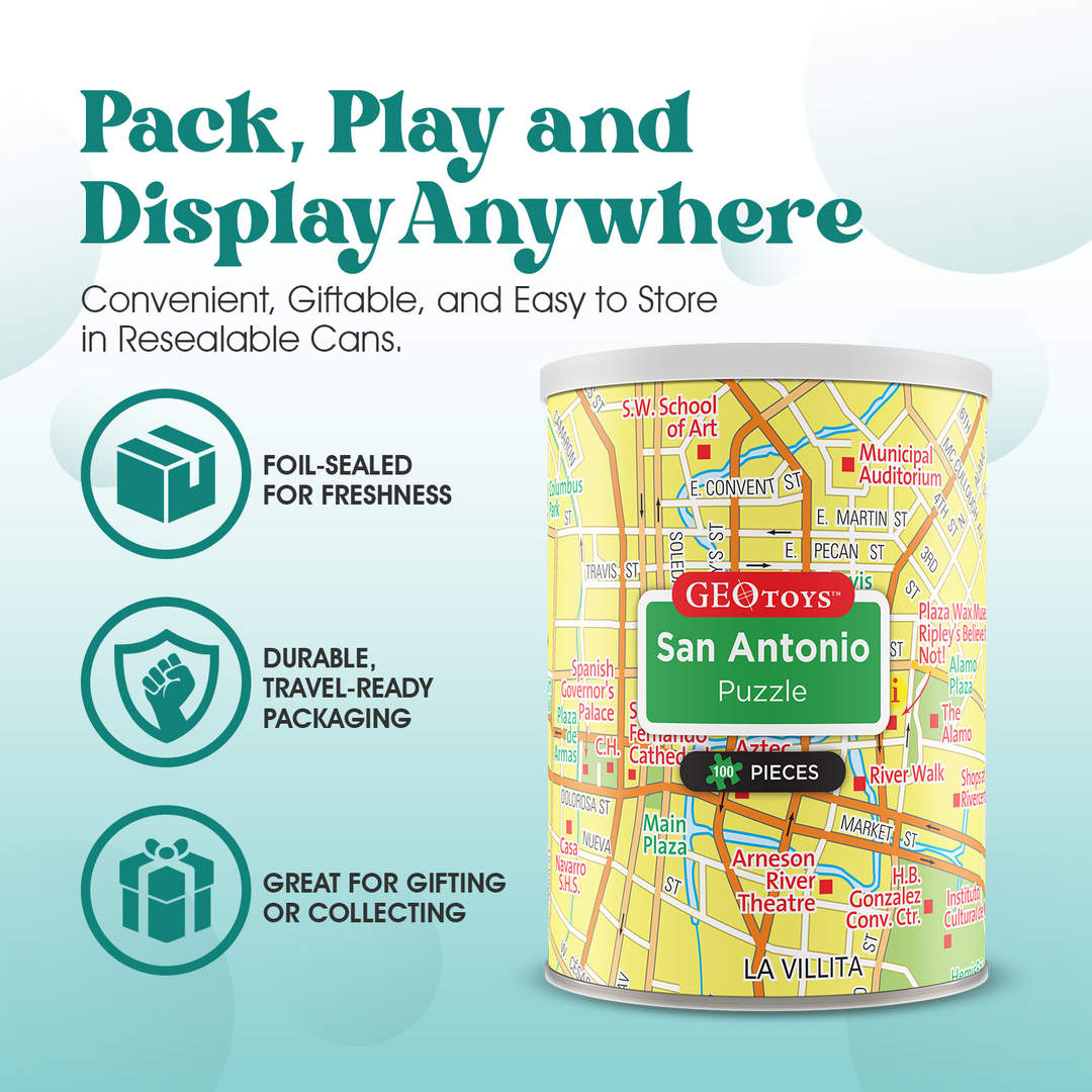 - FUN 100-PIECE PUZZLES: Our fun 100-piece puzzles give you a whole new perspective on your favorite cities, states and even the USA and Solar System.