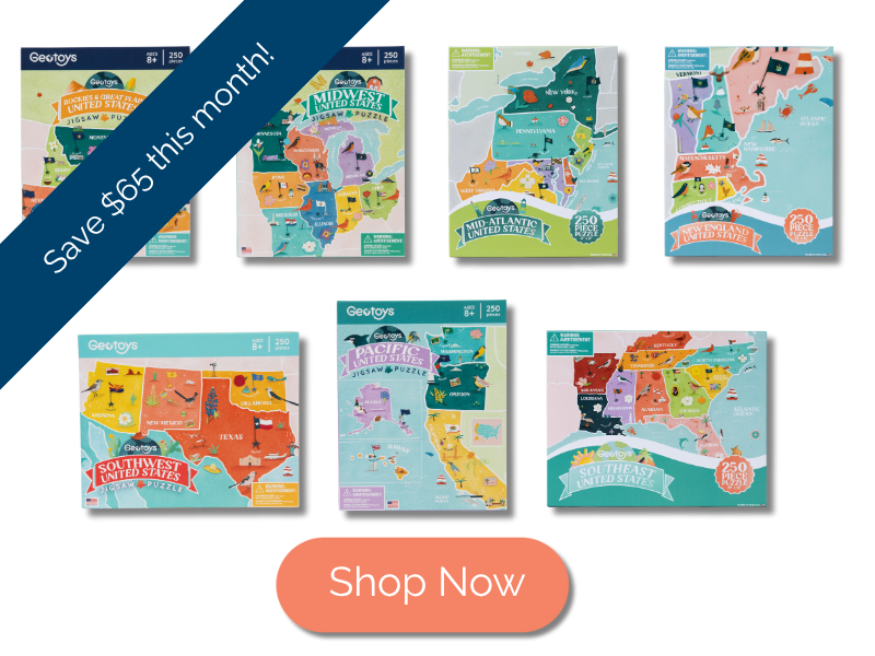 These 250-piece puzzles deliver a whole new perspective on the regions of the United States! Each puzzle features beautiful original illustrations, highlighting state landmarks, flags, flowers, and more. They make the perfect gift, stocking stuffer, or tourist souvenir.