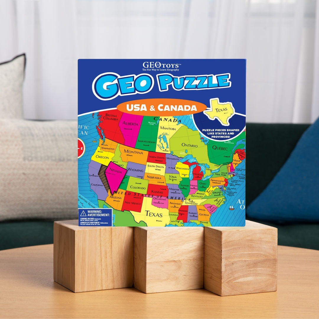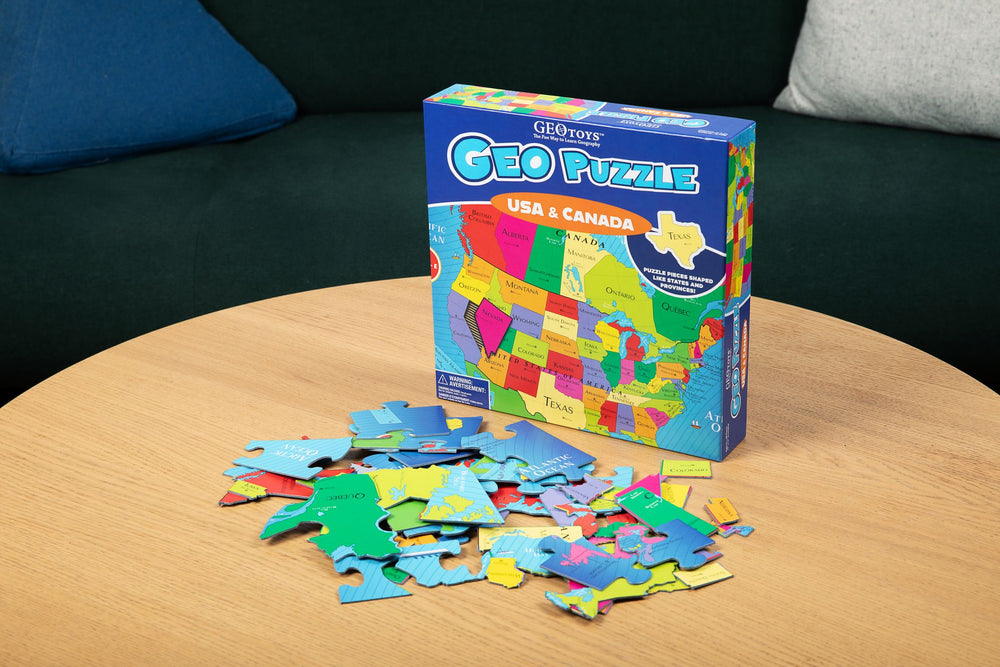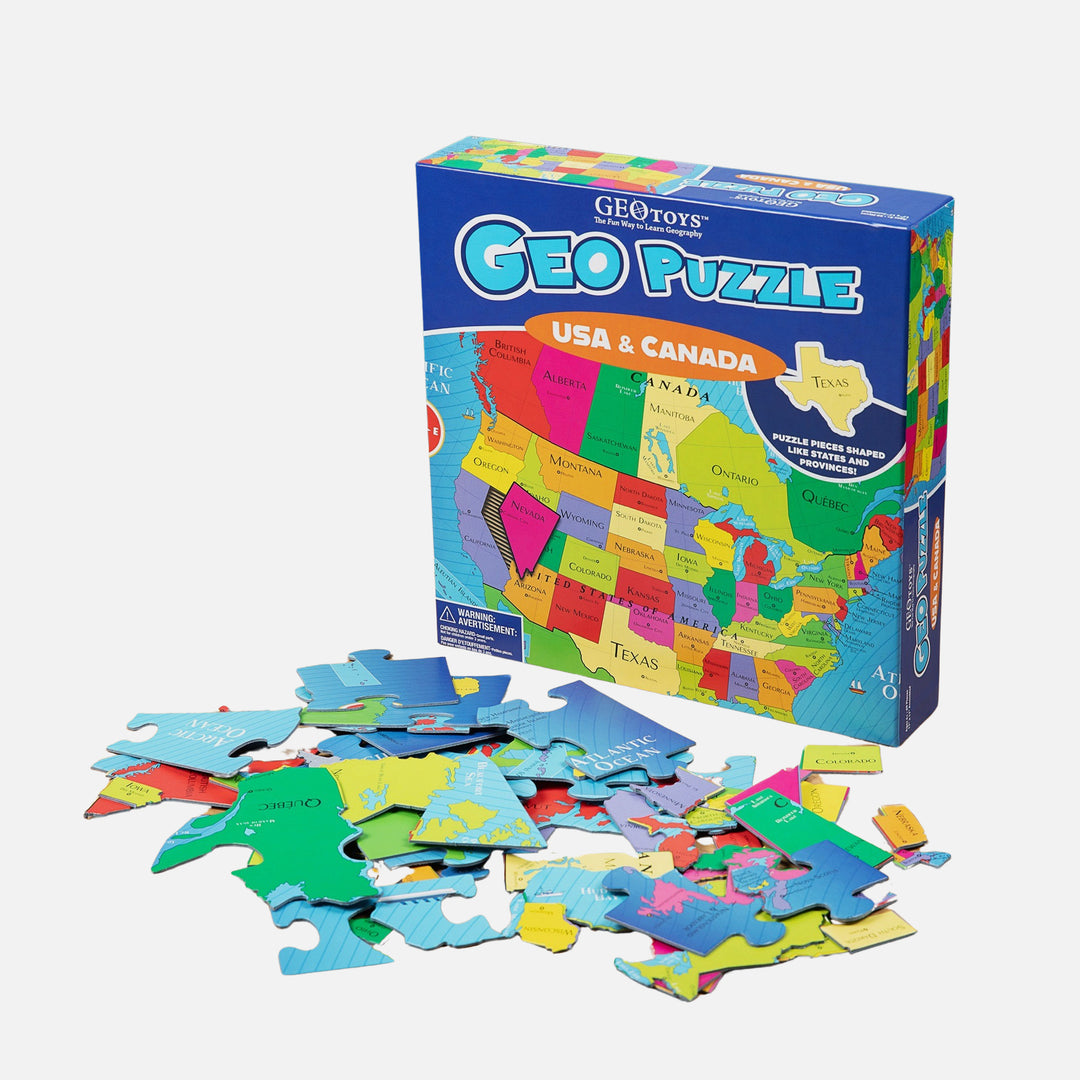 GeoPuzzles make learning geography fun! Give the gift of understanding our complex world. GeoPuzzle USA and Canada has 69 pieces shaped like states and provinces. Children learn the name and shape of each state and province, and they also learn its location on a map.